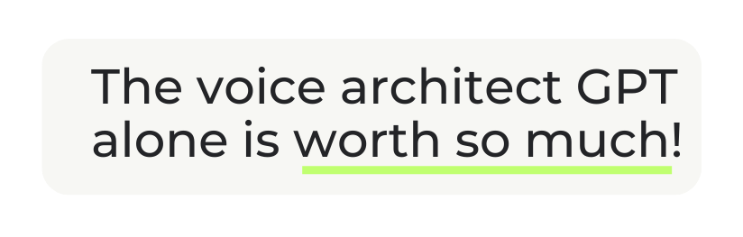 VoiceArchitect GPT goes first. She interviews you, and she'll ask you everything she needs to know about your brand voice, your business, your clients, your offers, how you naturally talk about your work. You just... answer. Like you're chatting to someone who genuinely wants to get it right.